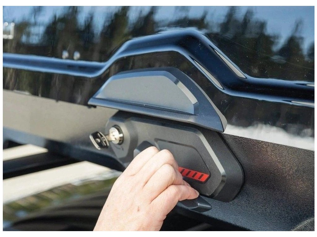 - Box sa otvára pomocou kľučky, čo je mimoriadne komfortné – spoľahlivo ju uchopíte aj v lyžiarskych rukaviciach. Oproti boxom, ktoré používajú otváranie pomocou kľúča, ide o výrazne pohodlnejšie riešenie. Rovnako pri zatváraní boxu stačí veko len dotlačiť a kľučka zaskočí do svojej východiskovej polohy.